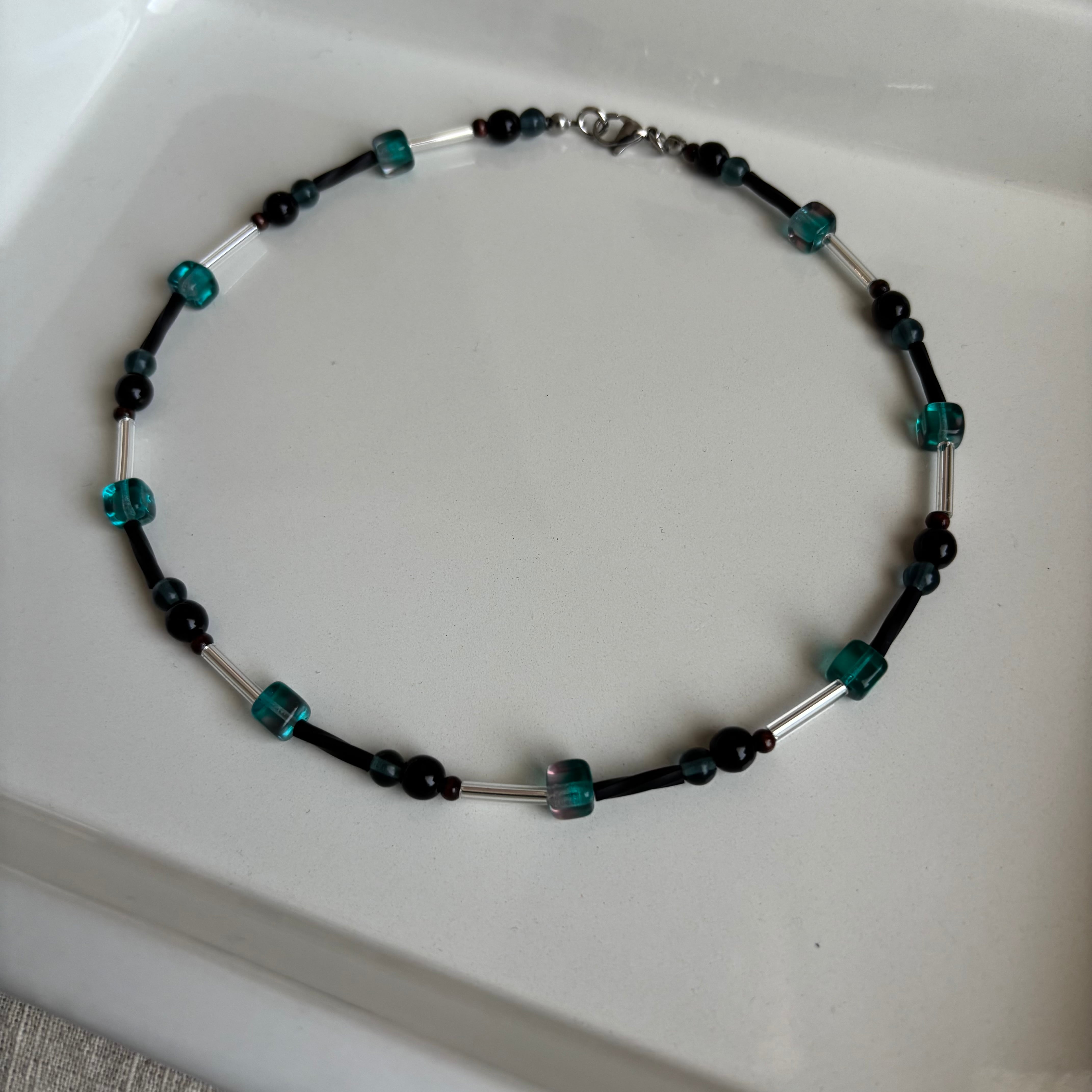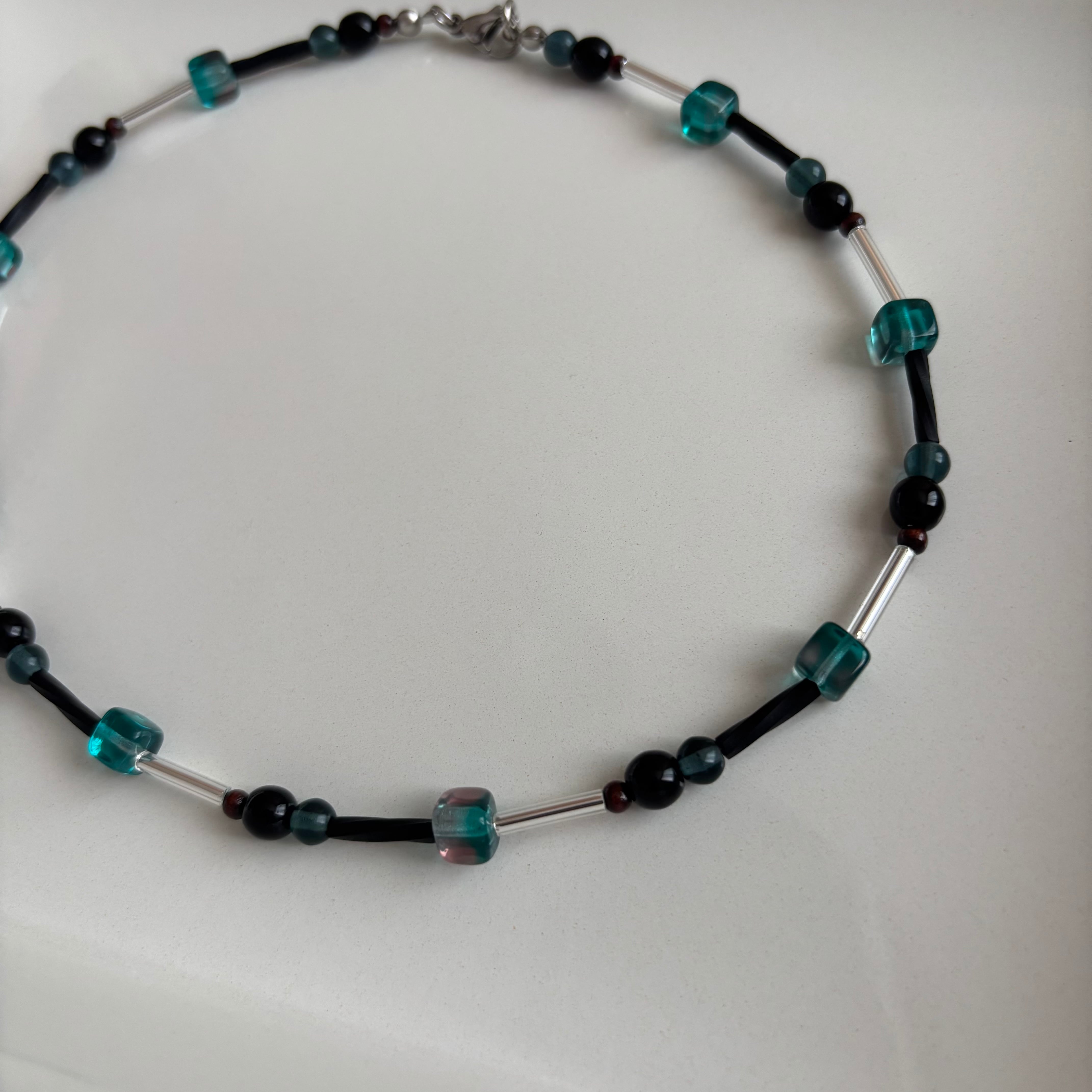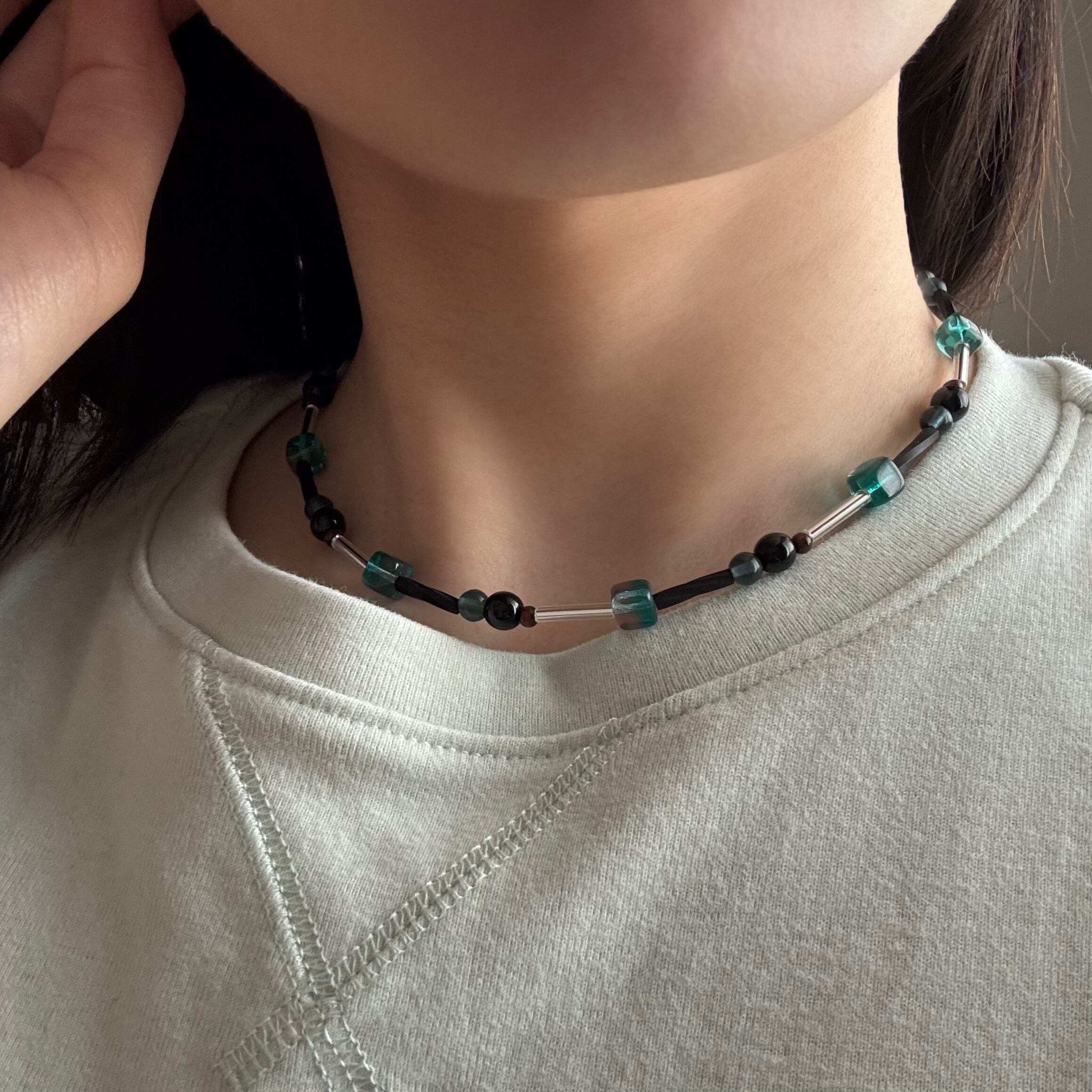 深みのあるグリーンのクリアパーツを主役に、シルバーのラインとブラックビーズでシャープに引き締めました。