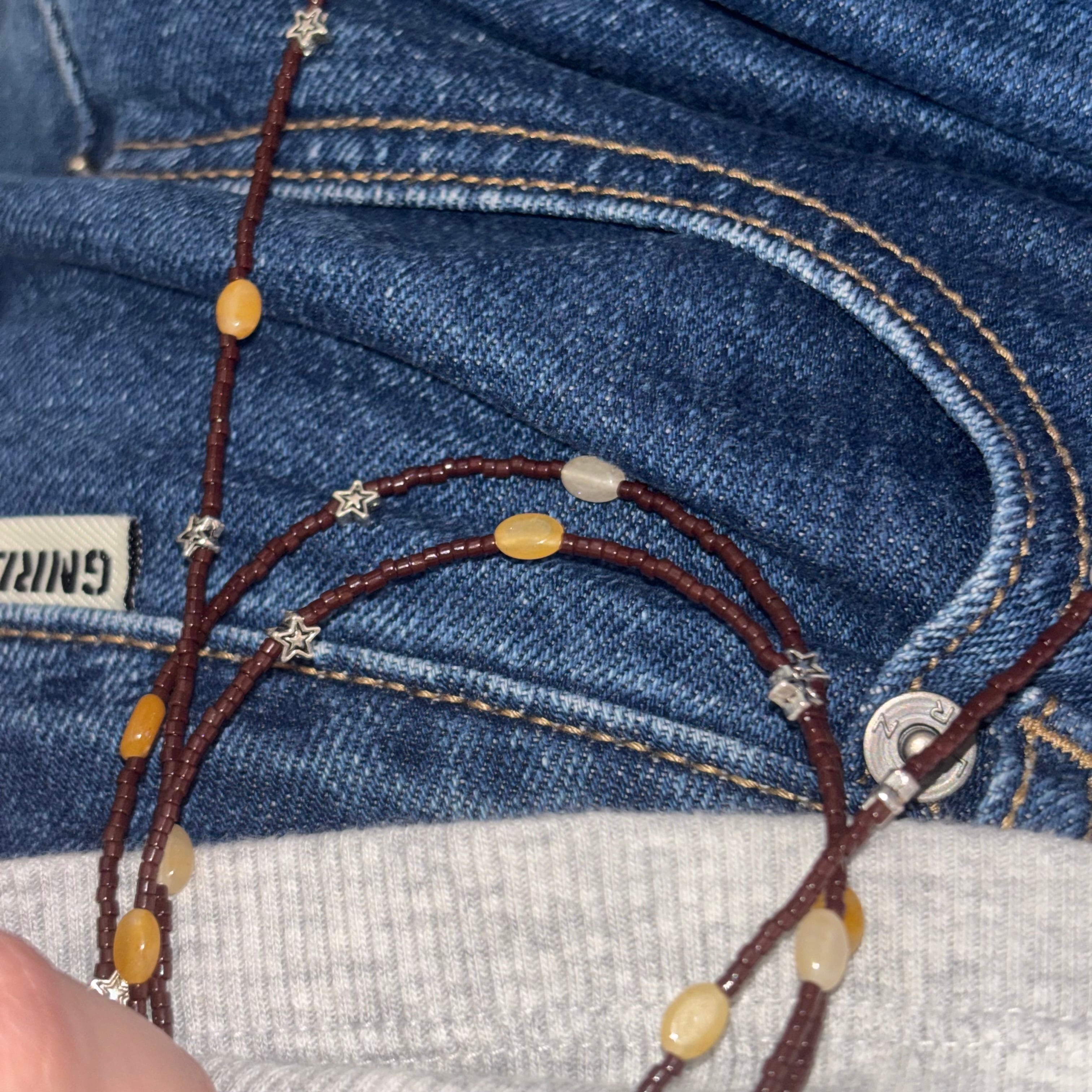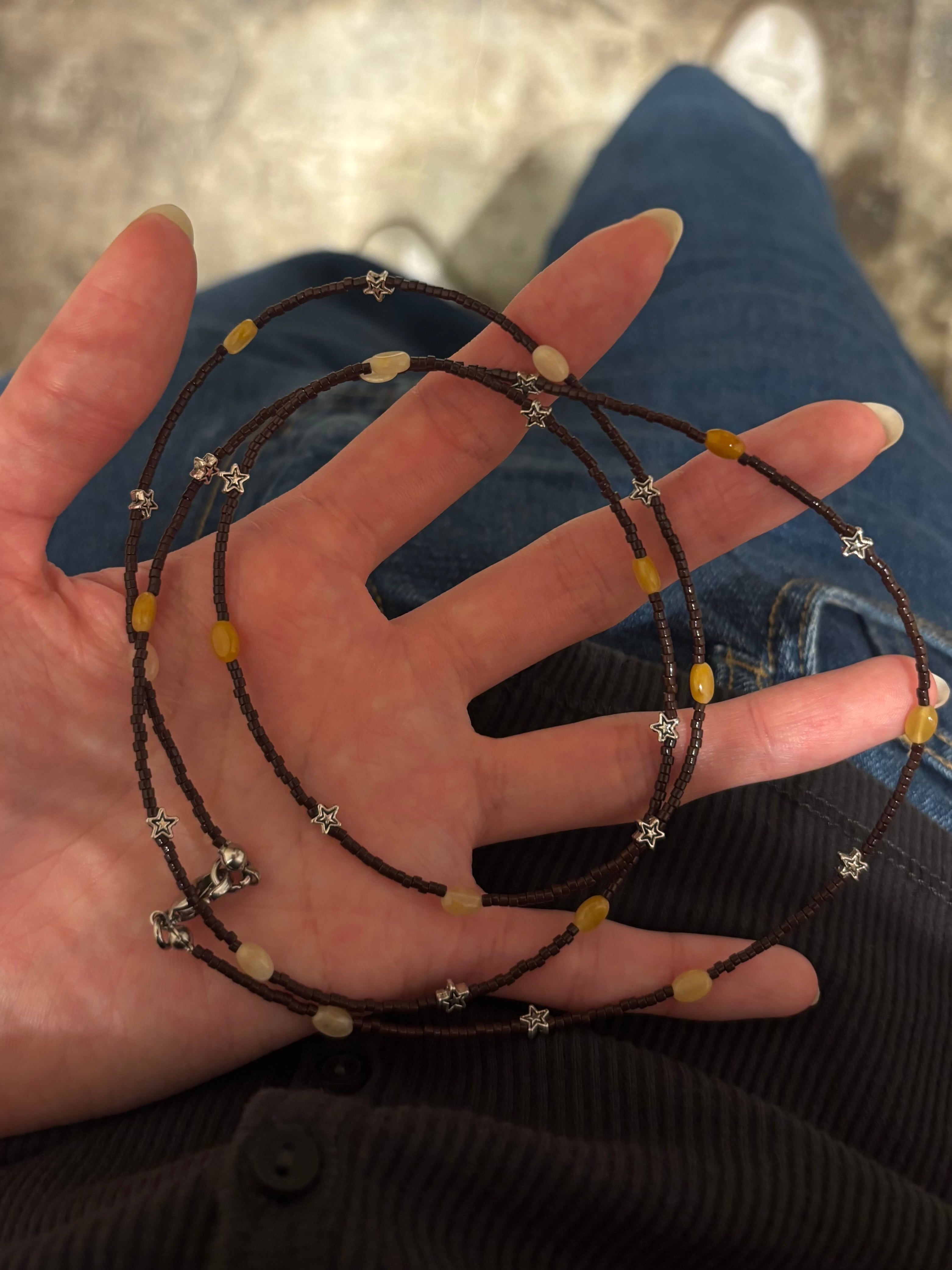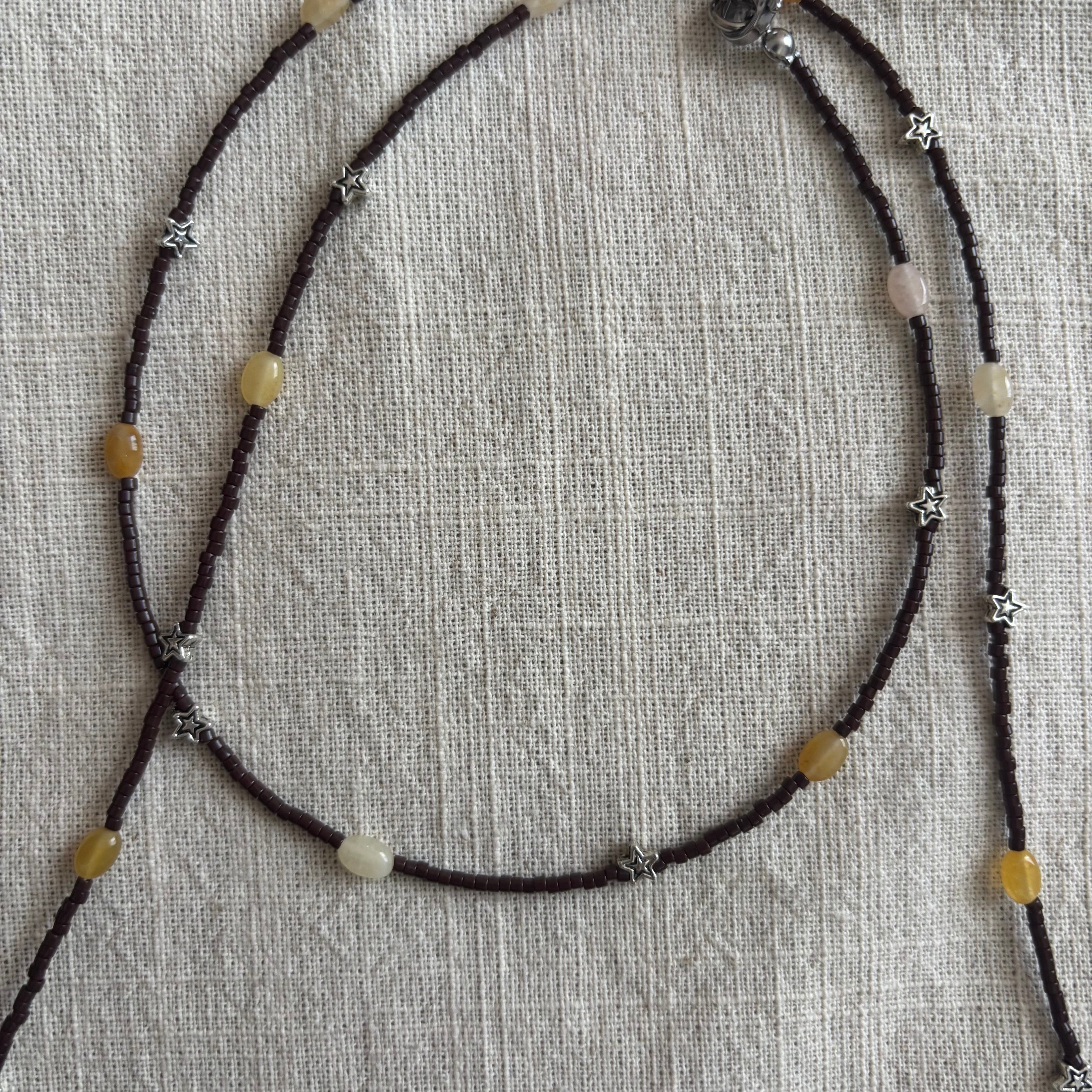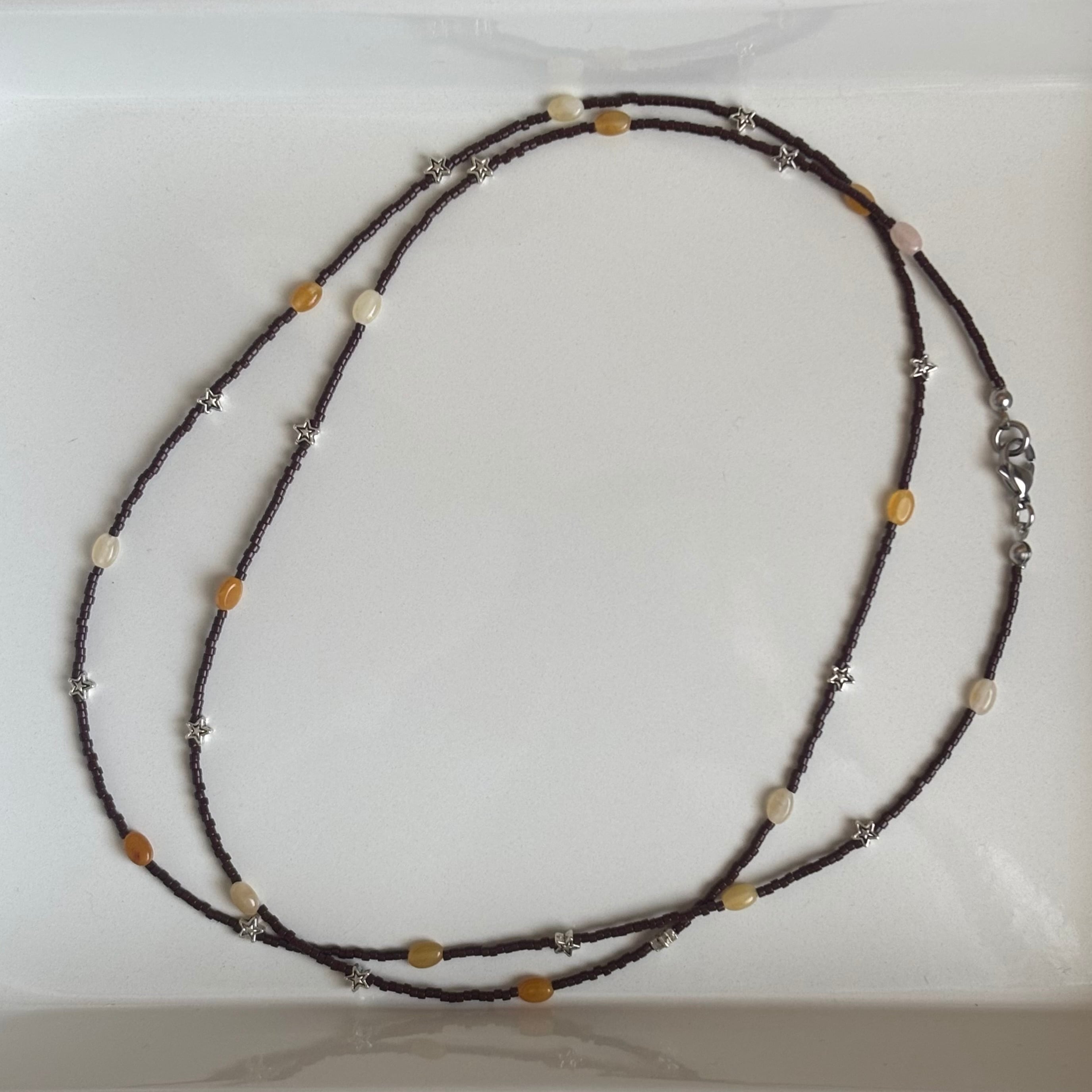 落ち着いたブラウンビーズに、シルバーの星パーツとレッドジャスパーアゲート(天然石)を散りばめた、表情豊かな2wayロングネックレス。