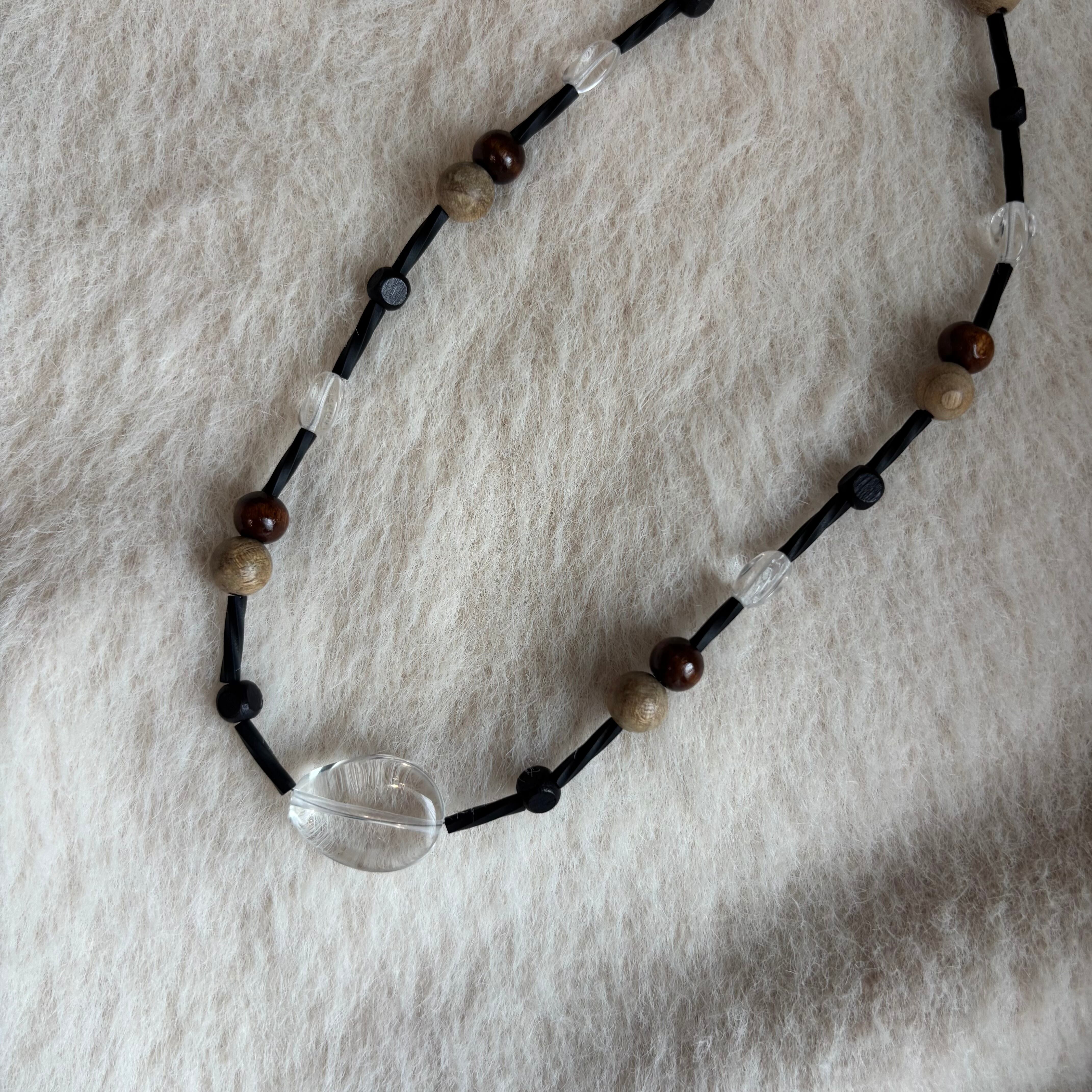 ウッドの乾いたテクスチャーと、大粒のクリアパーツのコントラストが目を引く一品。