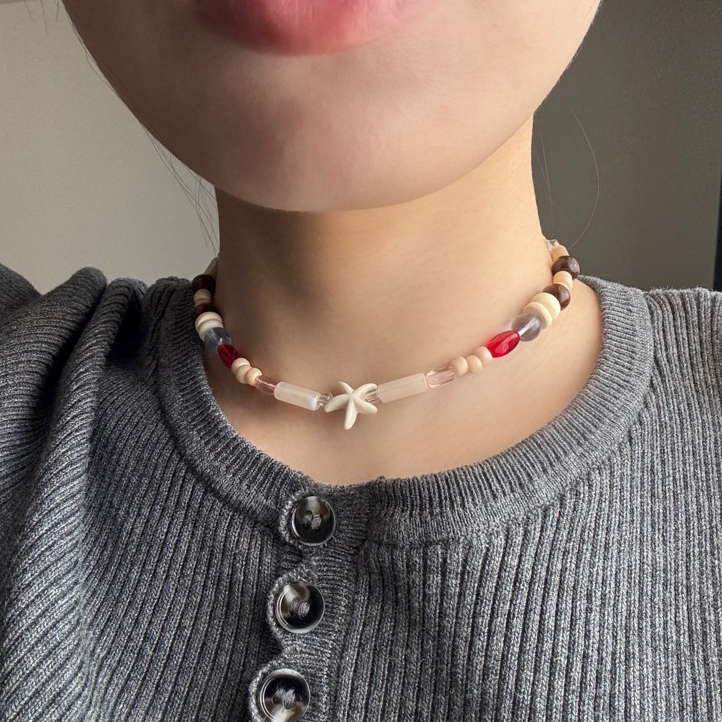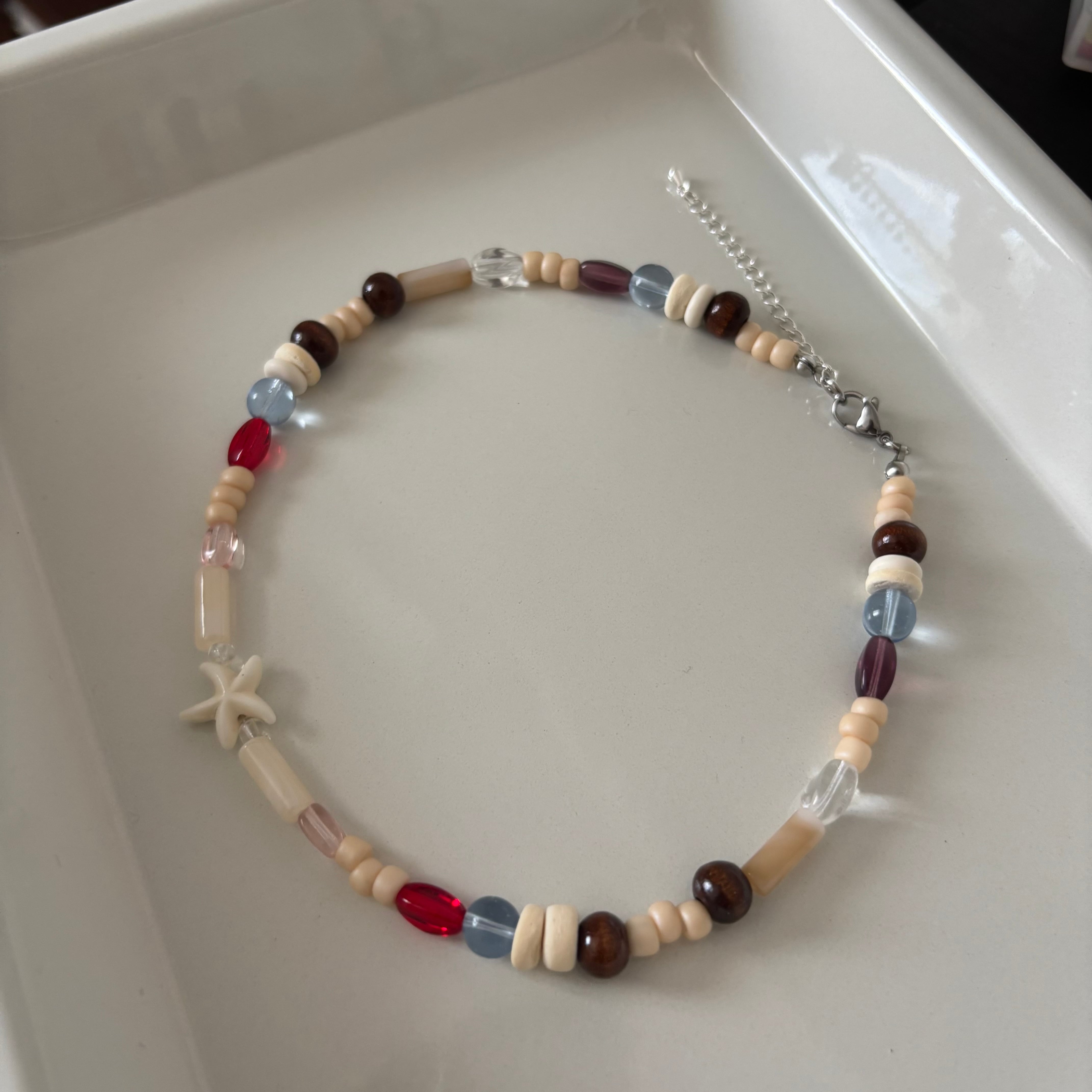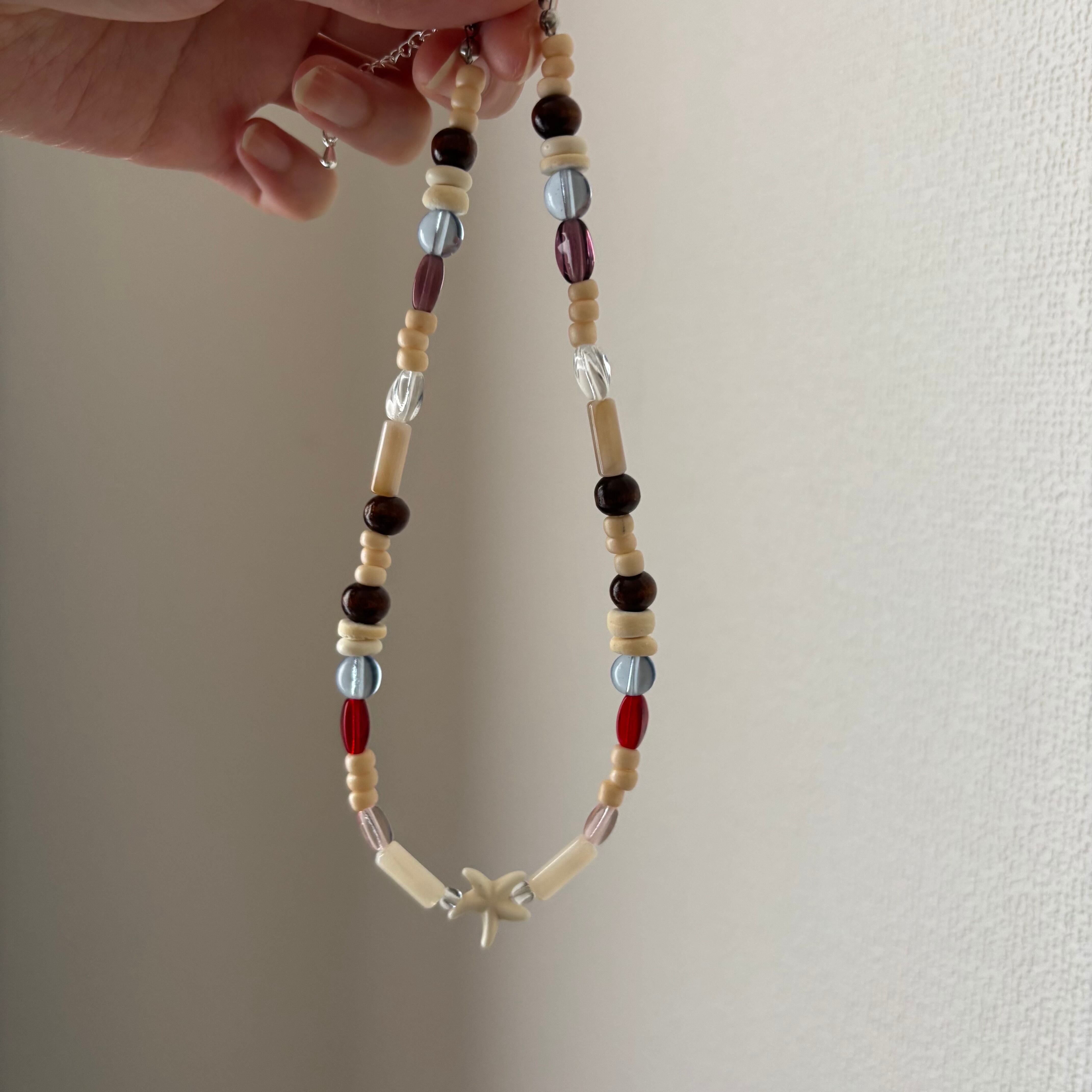 木製のビーズと海のモチーフを組み合わせた、ストーリーを感じる一作。